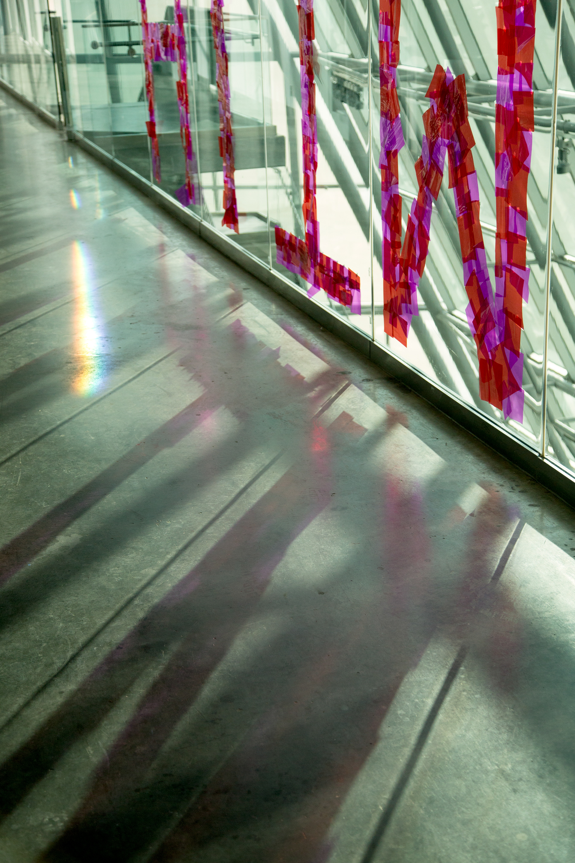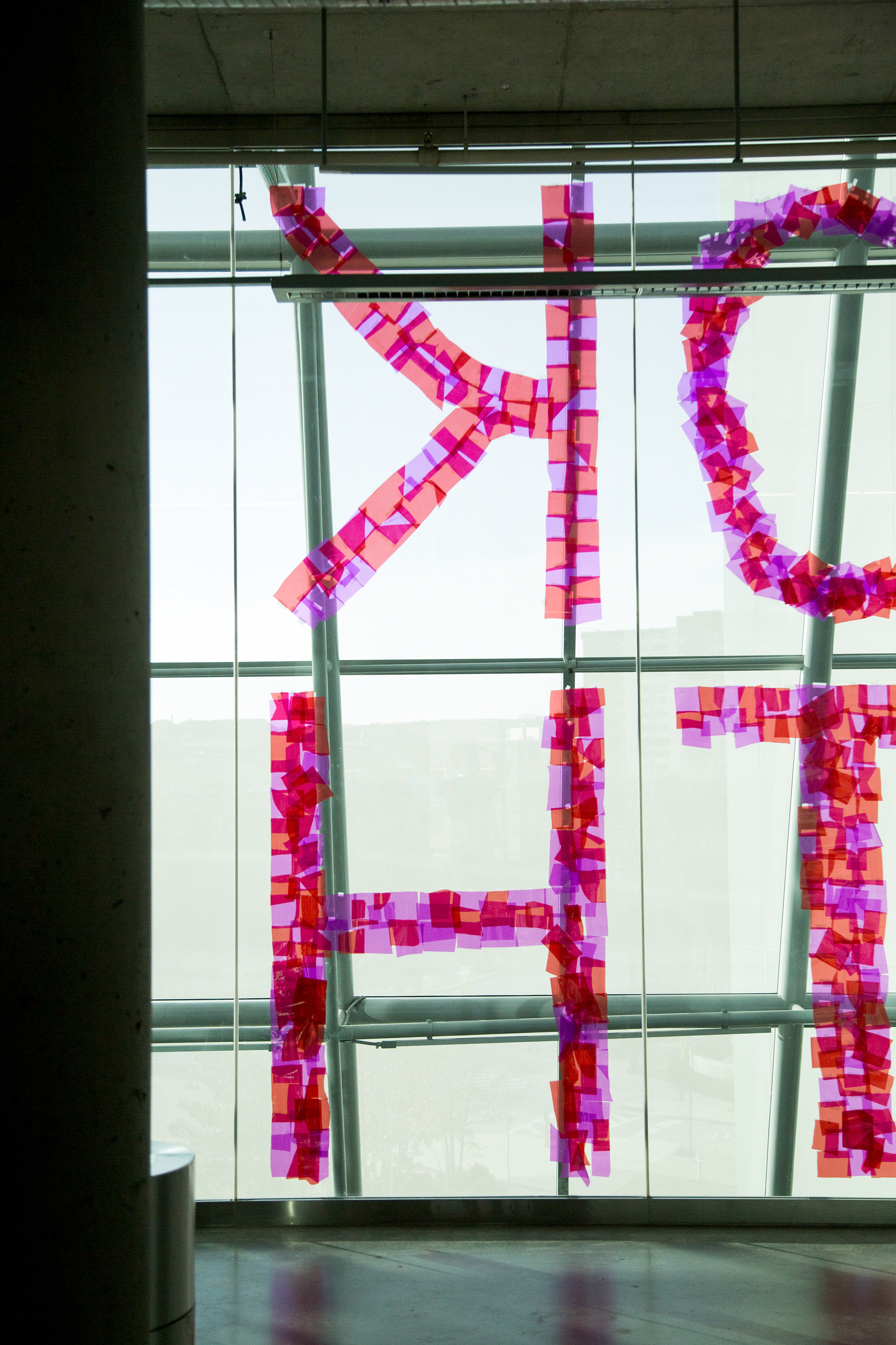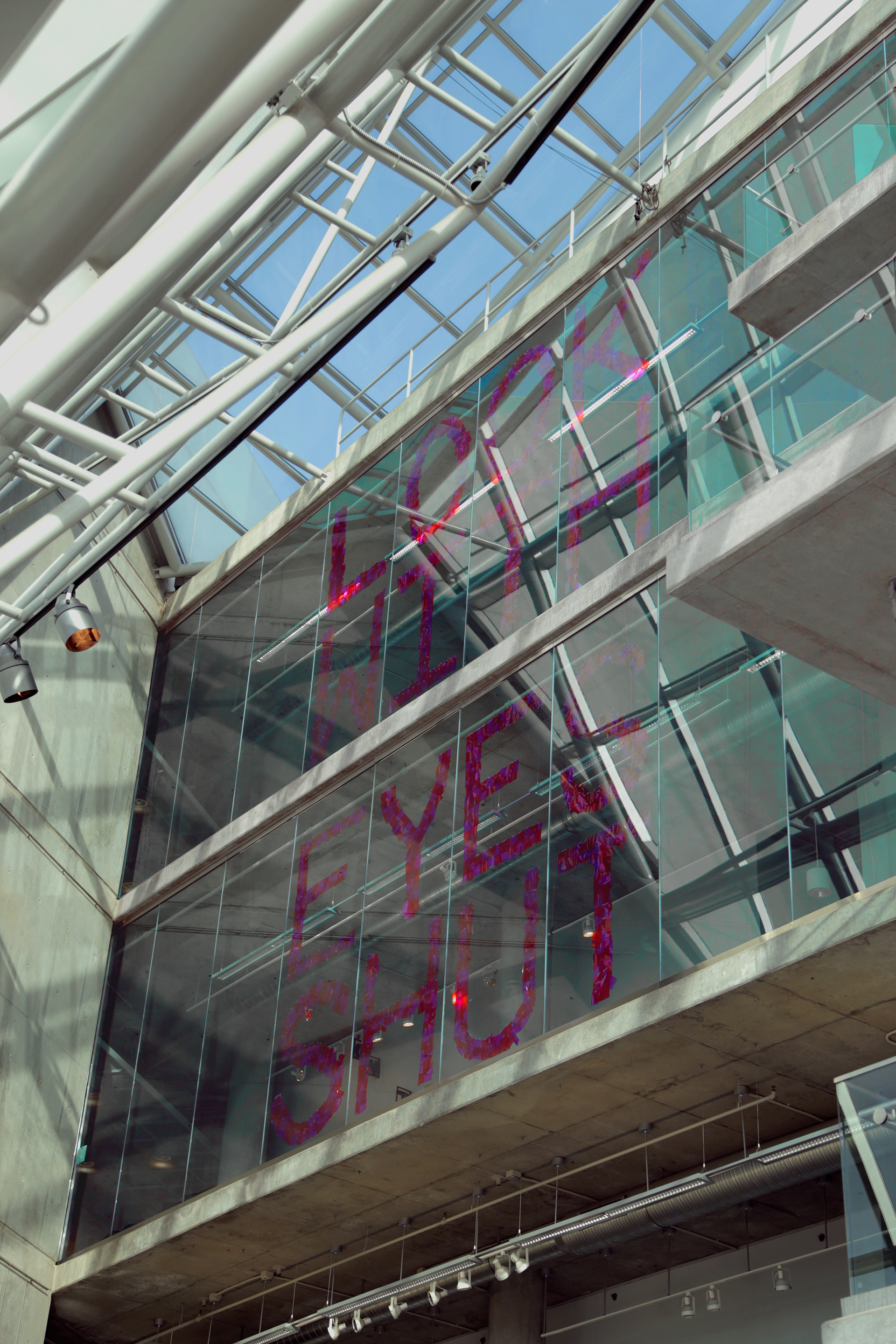 Look With Eyes Shut was a week-long, collaborative exhibition at MICA's Brown Center. Being in an academic setting, where students get little sleep, the goal of this exhibition was to remind students to sleep, and further, of the creativity that occurs while sleeping through our dreams. The type was constructed using pieces of red and purple cellophane, taped to glass walls on two separate floors of the Brown Center. In the hallways, the words read backwards, but when the sun hit the glass, the type was reflected onto the opposite wall to be read correctly, while warming up the environment with a stained-glass effect.