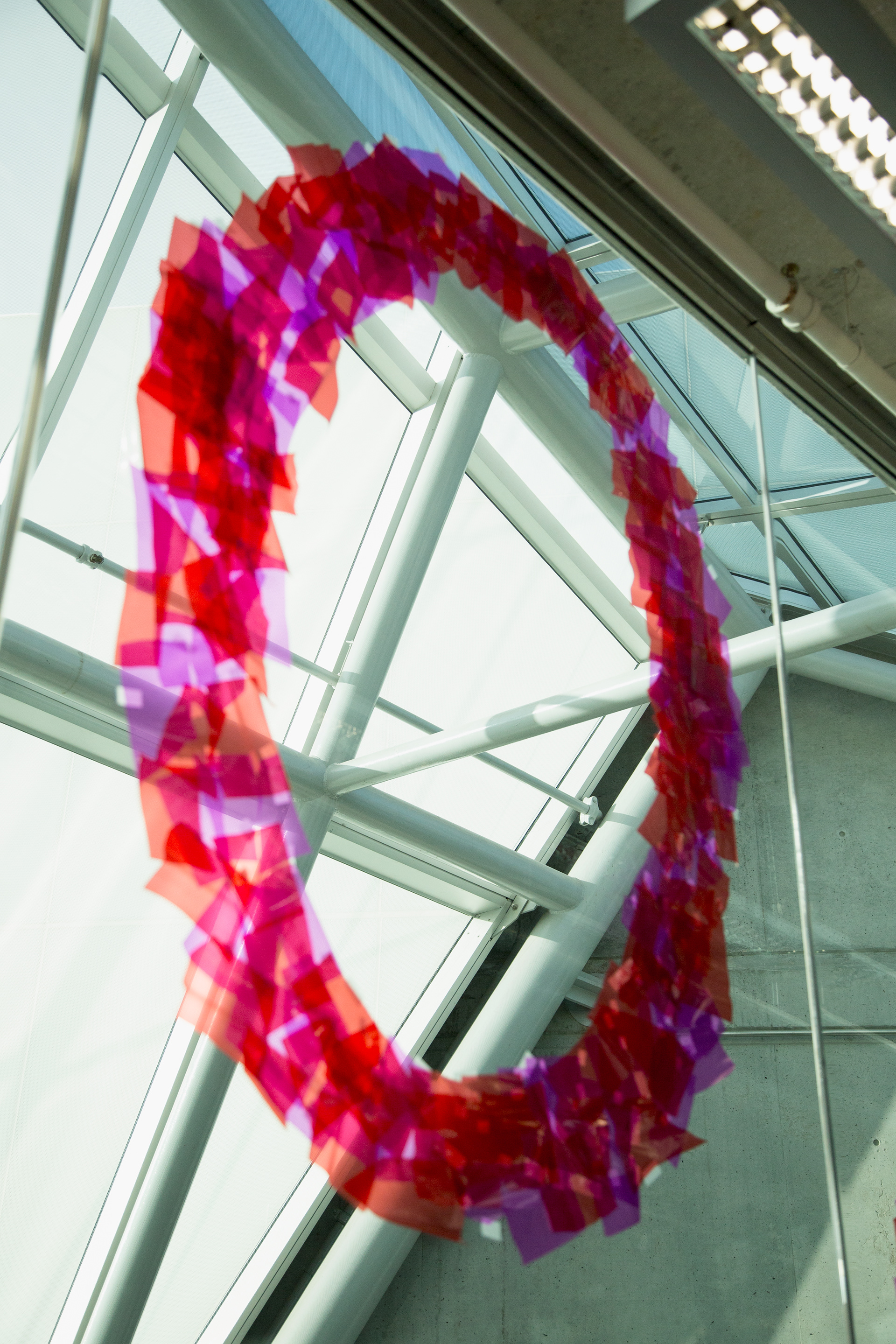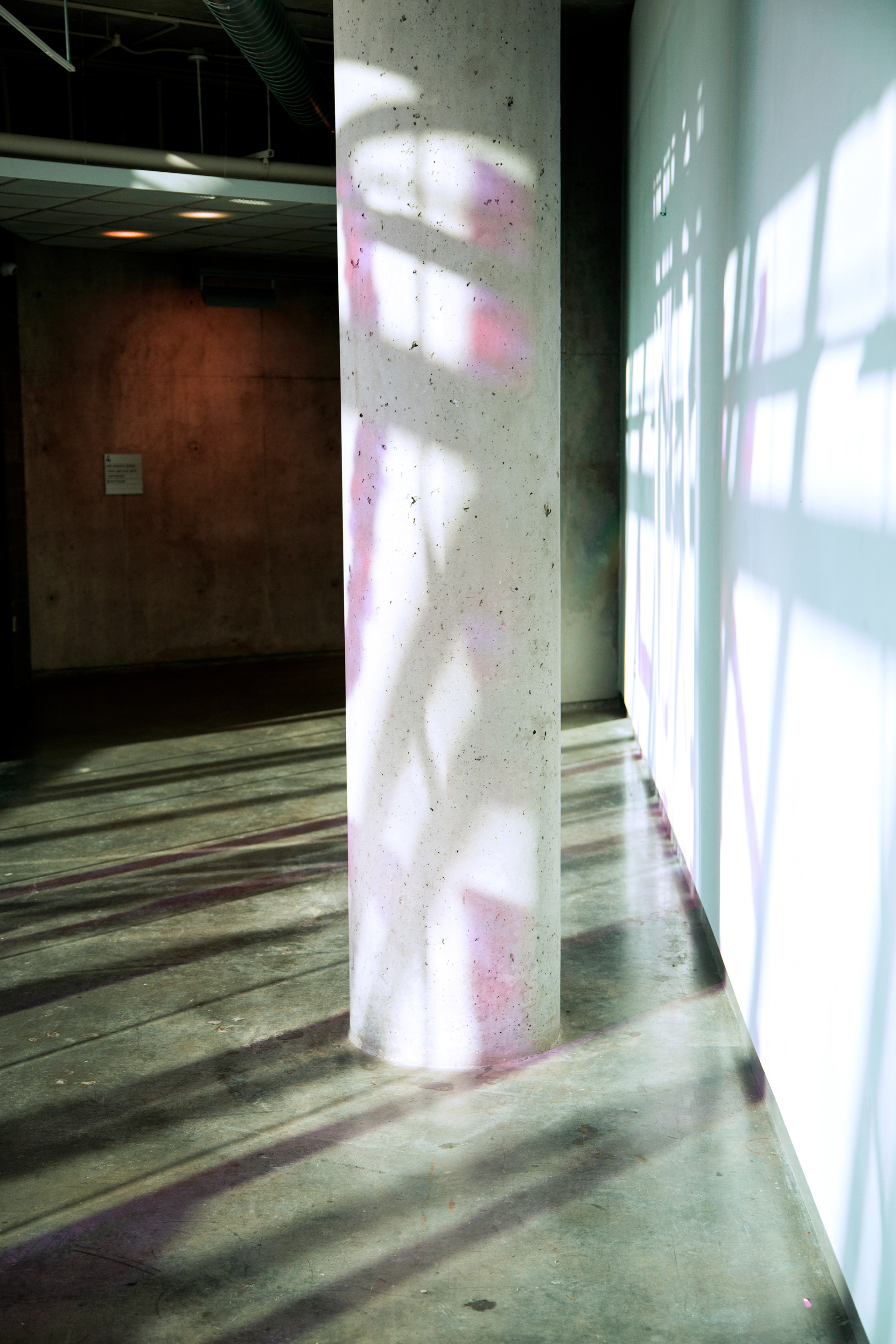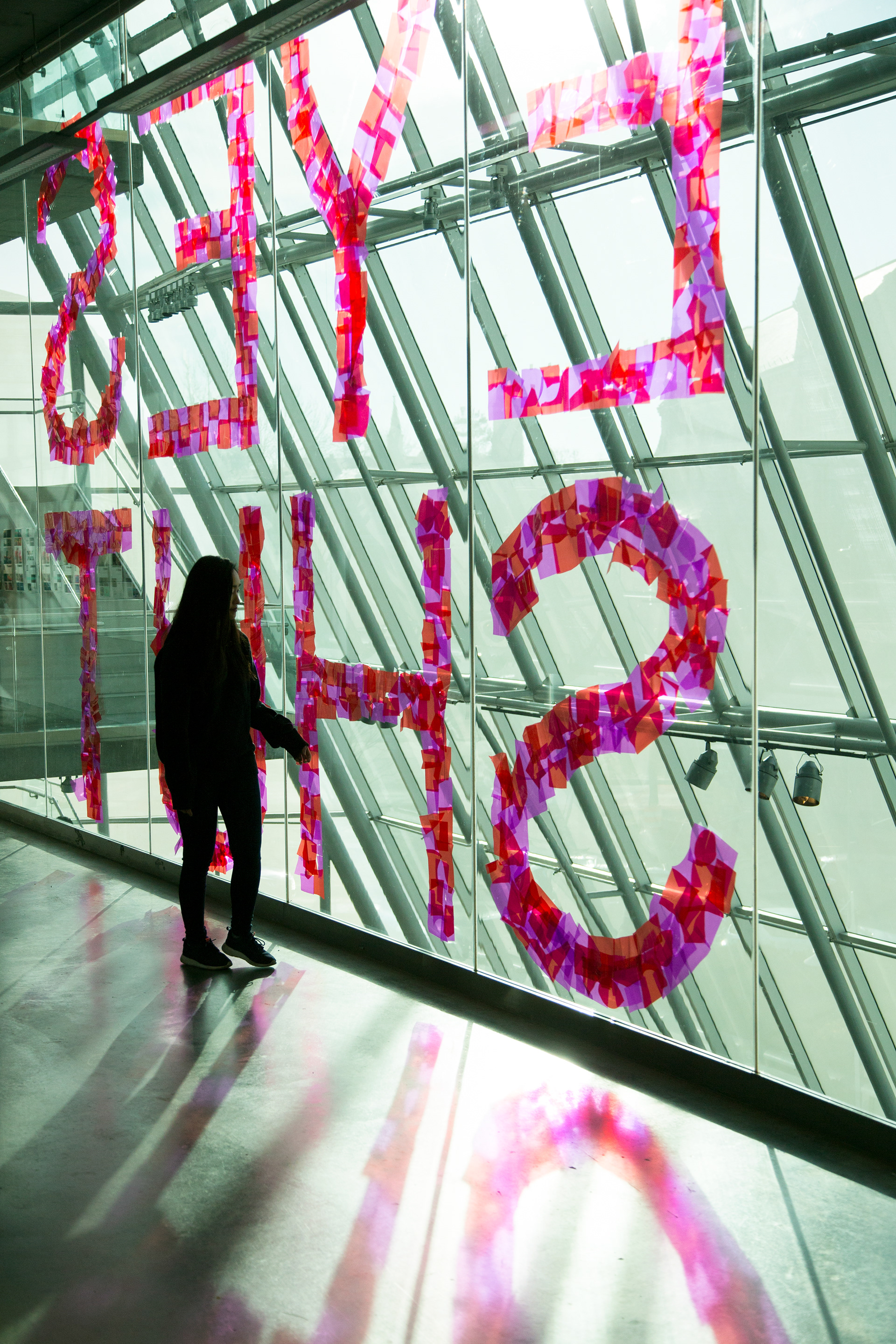 Look With Eyes Shut was a week-long, collaborative exhibition at MICA's Brown Center. Being in an academic setting, where students get little sleep, the goal of this exhibition was to remind students to sleep, and further, of the creativity that occurs while sleeping through our dreams. The type was constructed using pieces of red and purple cellophane, taped to glass walls on two separate floors of the Brown Center. In the hallways, the words read backwards, but when the sun hit the glass, the type was reflected onto the opposite wall to be read correctly, while warming up the environment with a stained-glass effect.